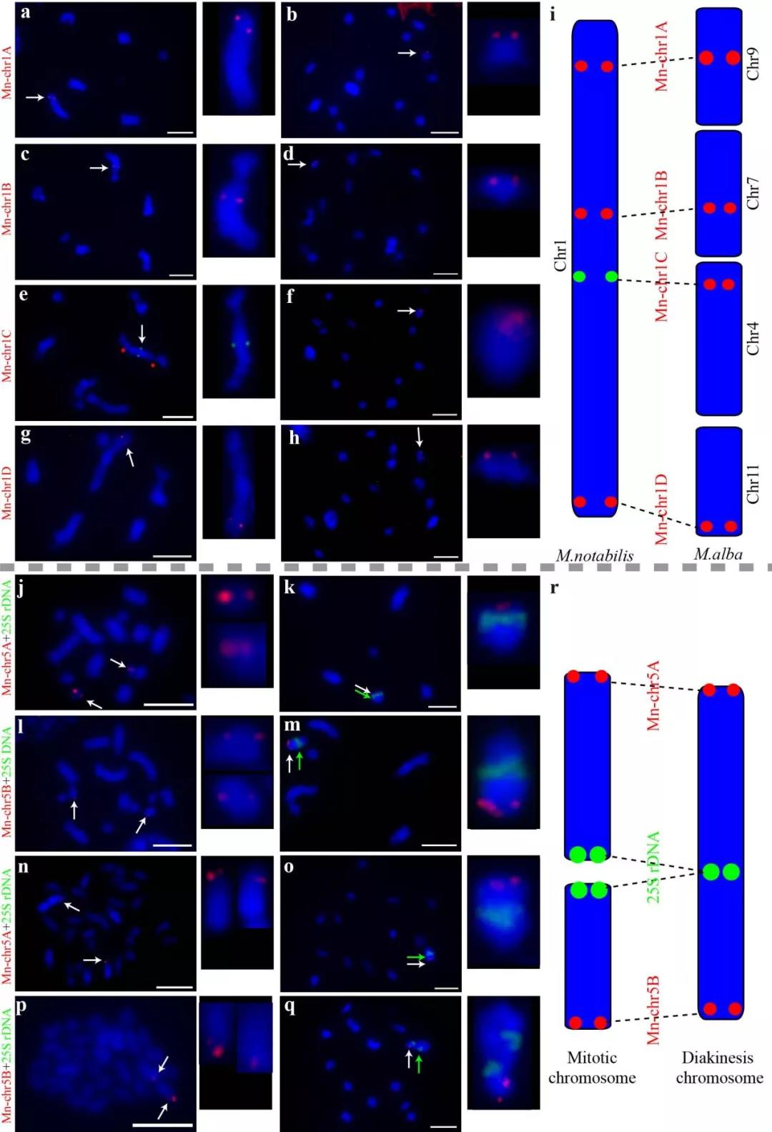 Figure 3. Chromosomal collinearity patterns verified by FISH, using single copy sequence probes and a 25S rDNA probe in M. notabilis and M. alba ‘Lunjiao109’