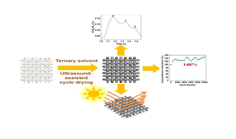 代方银教授团队研究人员将蚕丝织物用三元溶剂预处理,然后采用超声辅助循环干燥法直接制备了具有柔性超级电容器和传感器应用潜力的低成本、环保型、高性能还原氧化石墨烯丝织物电极(RGO-蚕丝织物)。