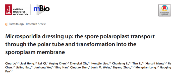 微孢子虫科研团队在微生物领域国际Top期刊mBio在线发表了题为Microsporidia dressing up: the spore polaroplast transport through the polar tube and transformation into the sporoplasm membrane(微孢子虫“换装”:孢子极膜层经极管运输后转变为孢原质膜)的研究成果,揭示了微孢子虫感染体-孢原质的细胞膜来源于成熟孢子的极膜层,回答了微孢子虫发芽机制中的关键科学问题。