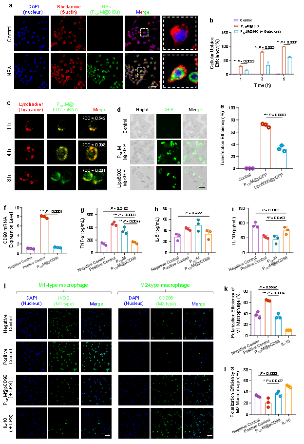 图1. 不同LNPs的体外细胞吞噬、抗炎活性及巨噬细胞极化