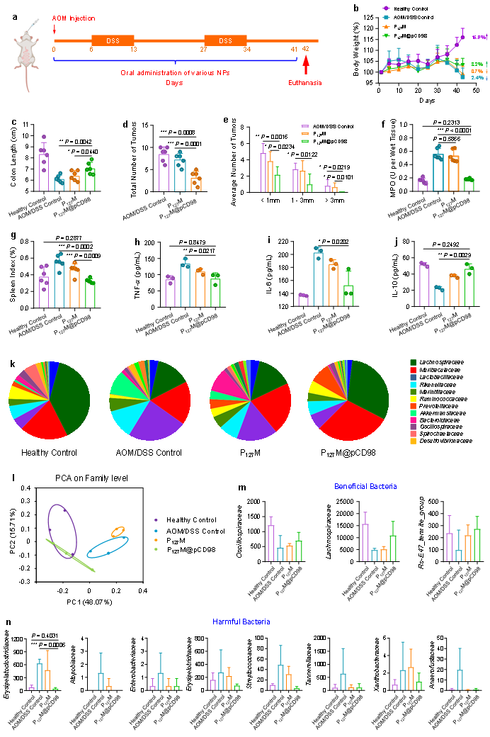 通过结肠长度、小鼠体重、髓过氧化物酶(MPO)值、脾脏指数、等参数评估了急性结肠炎的严重程度。发现P127M@pCD98通过降低促炎细胞因子(TNF-α和IL-6)水平,上调IL-10水平、恢复结肠组织形态,调节CD4+、CD8+免疫细胞数量以及肠道微生物平衡,减缓炎症;另外,该研究还揭示了CD98表面糖蛋白在结肠炎症发展中的关键信号通路(图3和图4)。不仅如此,实验结果还证实了P127M@pCD98口服后,可有效延缓CAC进展,提高有益菌的丰度,并减少有害菌的数量(图6)。