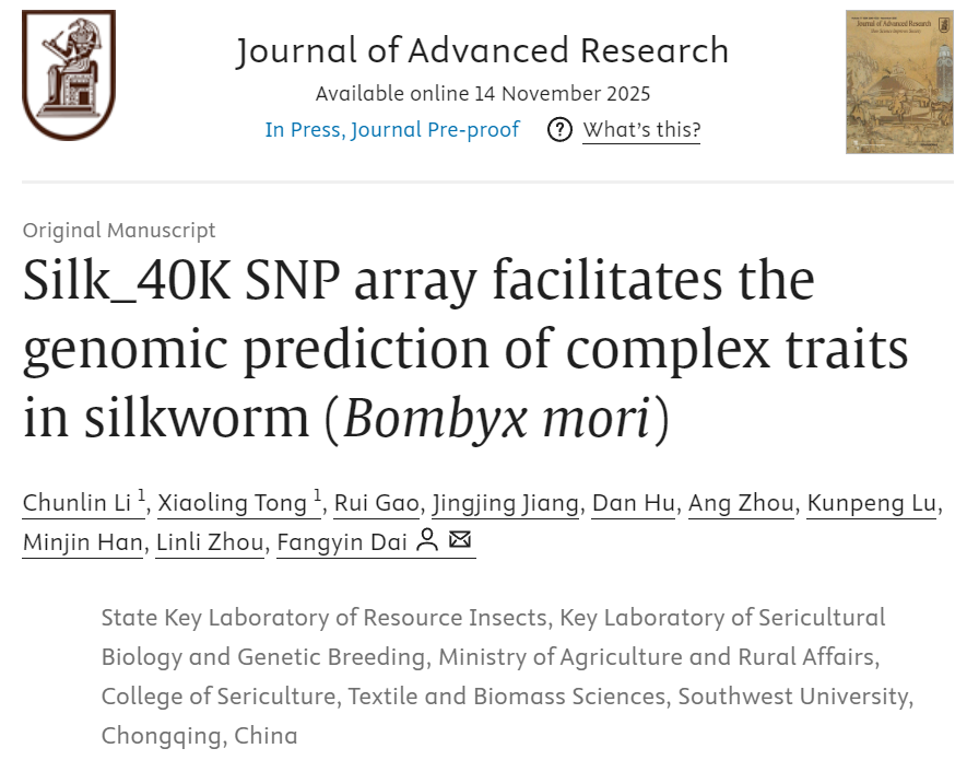 age动漫 age动漫 主任、国家蚕桑产业技术体系首席科学家代方银教授团队基于前期成果“千蚕泛基因组”研发首款家蚕全基因组SNP育种芯片Silk_40K SNP Array首次证明基于育种芯片的基因组选择可实现家蚕复杂育种性状的高效改良,为家蚕基因组选择育种提供了关键工具与理论支撑。20251114日,研究成果在线发表于国际知名期刊Journal of Advanced Research(中科院一区TopIF=13)。