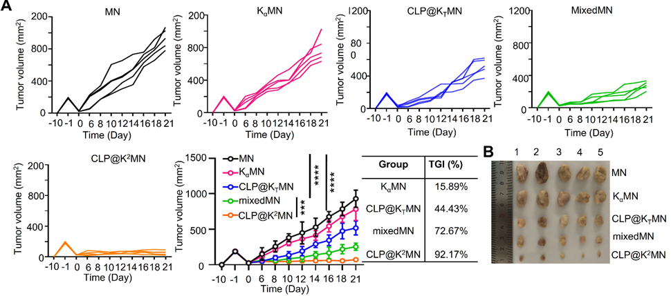 A) 不同治疗组4T1肿瘤的体积(n = 5);B) 治疗21天后的肿瘤照片(n = 5)
