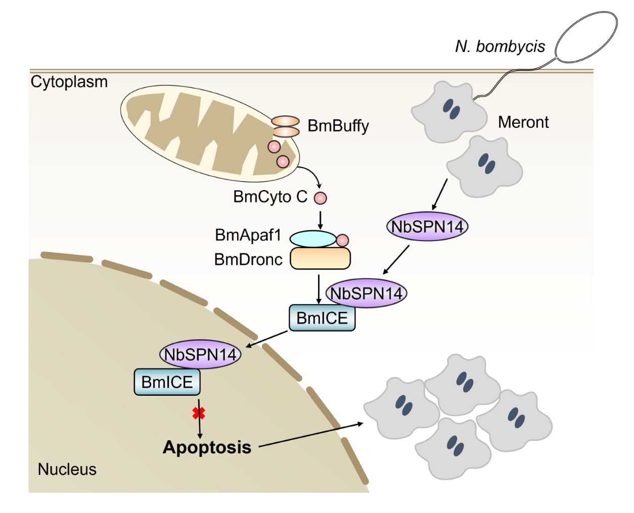 家蚕微孢子虫分泌NbSPN14抑制宿主细胞凋亡模式图