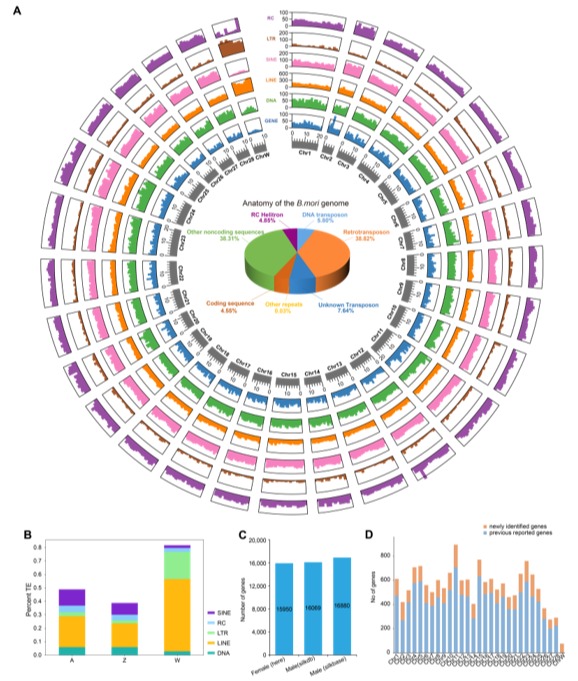 (1)获得了家蚕高质量的W染色体序列,并且发现家蚕W染色体包含雌性性别决定因子(Fem)137个拷贝,蛋白编码基因76个,这些信息对解析家蚕性别决定机制以及基于W染色体的分子育种具有重要价值。