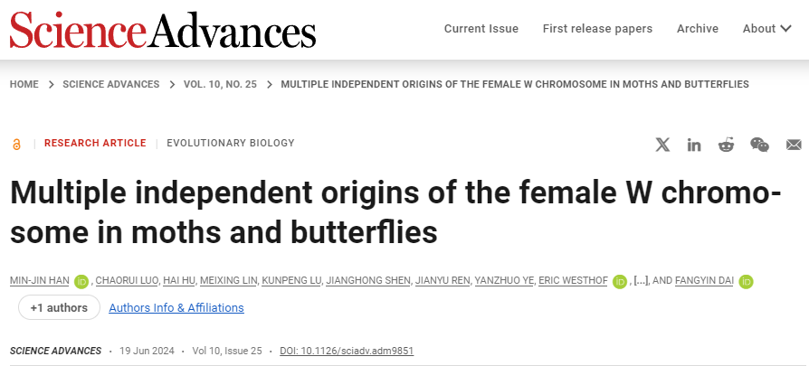 代方银教授团队题为“蛾类和蝶类昆虫雌性W染色体的多重独立起源”(Multiple independent origins of the female W chromosome in moths and butterflies)的研究论文。该研究首次获得了家蚕W染色体完整基因组序列,并揭示鳞翅目昆虫W染色体起源与进化的新机制。研究结果不仅在基因组与进化生物学领域具有重要理论意义,而且在家蚕等鳞翅目昆虫的性别调控的研究方面具有重大价值,并为家蚕分子育种带来新的前景。