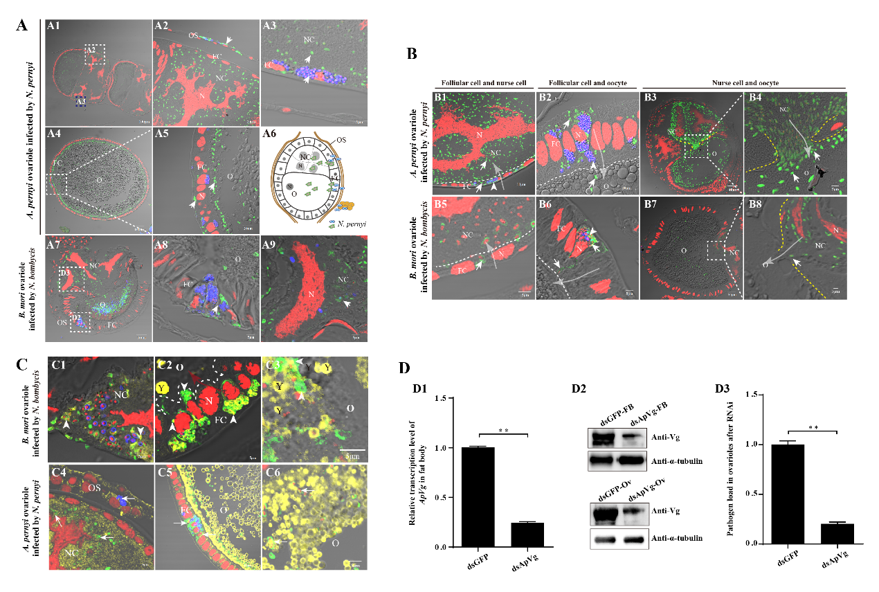 微孢子虫研究团利用N. pernyi感染柞蚕,N. bombycis分别感染家蚕、棉铃虫和斜纹夜蛾,比较分析了微孢子虫经卵巢垂直传播过程和机制的保守性及差异。研究发现,两种微孢子虫侵入宿主卵母细胞的路径高度相似,均依次感染卵鞘细胞、滤泡细胞、滋养细胞,最终侵入卵母细胞。然而,两种病原的垂直传播过程存在明显差异:N. bombycis仅在卵黄发生期(卵巢管暴露于血淋巴)才能侵染卵巢管,而N. pernyi则在柞蚕蛹滞育期即可侵染卵巢管。此外,N. bombycis对卵巢管各细胞的感染率较低,且在卵母细胞和滋养细胞中均能产生成熟孢子;而N. pernyi的感染率较高,且在卵巢管各细胞中主要处于增殖状态。为深入揭示微孢子虫垂直传播的分子机制,研究团队对家蚕和柞蚕的卵黄原蛋白(vitellogenin, Vg)进行RNAi分析,发现卵巢管中的病原载量显著降低,揭示了Vg在微孢子虫垂直传播中的保守性和关键性作用。