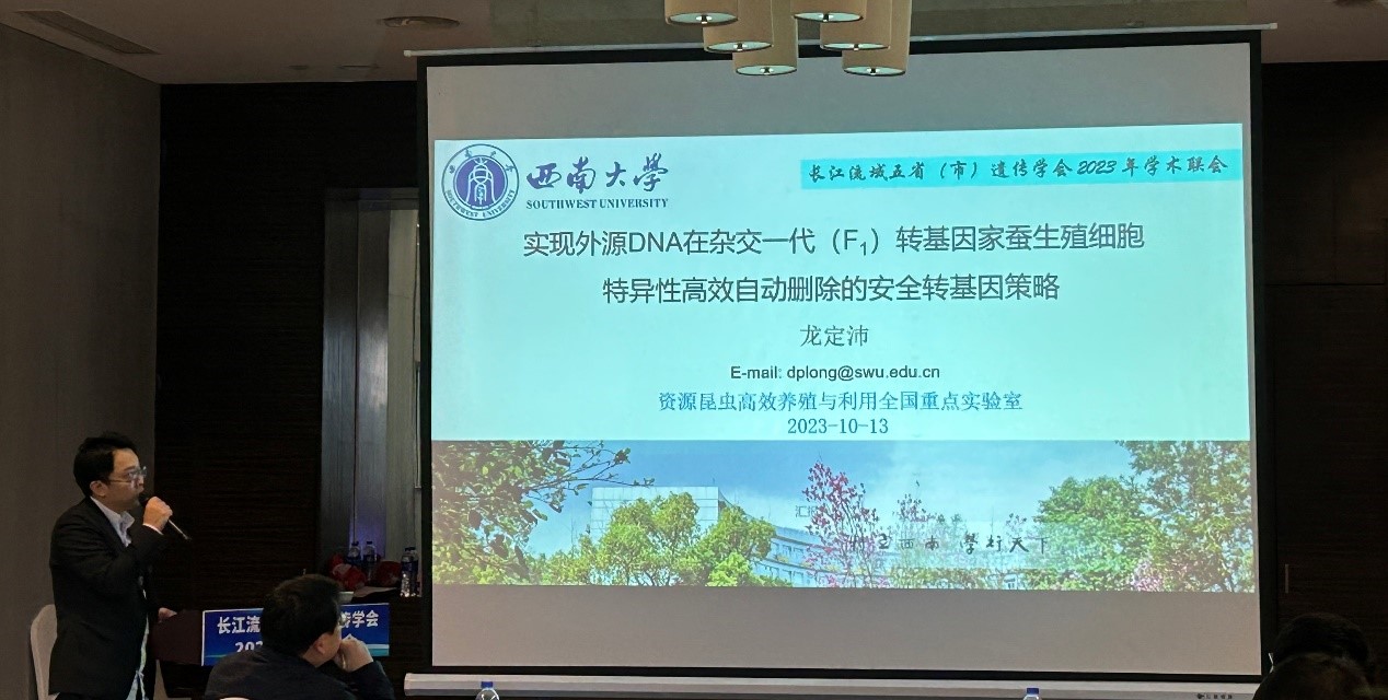 青年教师龙定沛副教授做了题为“实现外源DNA在杂交一代(F1)转基因家蚕生殖细胞特异性高效自动删除的安全转基因策略”的学术报告,引起广泛讨论。