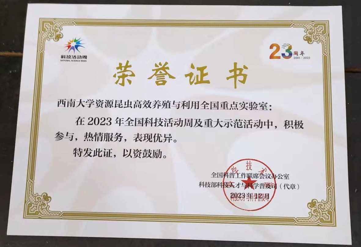 保持全年向公众免费开放,并适时开展各类科普活动。2023年实际开放达200多天,服务受众涉及20多个国家和地区,全年接待来访和走出去服务共计受众超过1.5万人次。其中包括但不限于:接待政府机关、企业代表、行业协会、大中小幼学生等来访共24批,1200多人次;参加重庆市科技活动周主场展览活动、重庆市全国科普日主场活动暨首届两江新区科普文化节主会场科普助力“双减”展区,2场活动吸引了4000多人次驻足体验;定向对接中小学开展科普教育,其中重庆八中和大英中学研学团300余人来室听取专题讲座,赴银翔中学为该校400余名学生讲解蚕桑科技知识;深入基层向蚕户、企业与技术人员科普养殖、疫病防控等专业知识,共计23场次,受众2300多人次;参与承办第28届华夏园丁大联欢活动,接待香港、澳门、台湾及内地的大中小学24名教师参观;协办第七届“一带一路”青少年创客营与教师研讨活动,接待来自20个国家和地区的38名师生参加活动;举办年度“蚕桑文化节”和“蚕丝科普月”,受众超过6000人次。