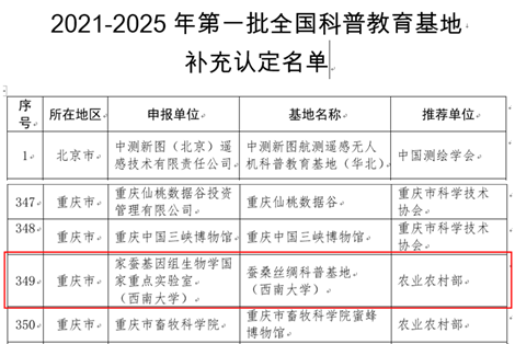 据中国科协11月29日发文《中国科协关于命名2021-2025年第一批补充认定的全国科普教育基地的决定》(科协发普字〔2022〕54号),为推动《全民科学素质行动规划纲要(2021—2035年)》的贯彻落实,团结引领广大科技工作者和科普工作者,显著提升社会化科普工作能力,中国科协启动了2021-2025年度第一批全国科普教育基地补充认定工作。中国科协组织专家对申报单位及材料进行认真审核,经过初评、终评和公示,中国科协决定命名474个单位作为2021-2025年度第一批补充认定的全国科普教育基地。其中,由家蚕基因组生物学国家重点age动漫