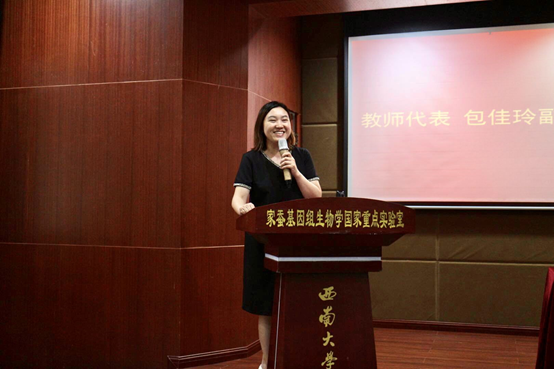 包佳玲老师作为教师代表,首先强调了遵守实验规程及管理制度的重要性。通过“埋头拉车和抬头看路”建议研究生要在尊重导师研究方向安排的同时,要保持学习研究领域前沿进展的热情,做面向世界科技前沿、面向经济主战场、面向国家重大需求、面向人民生命健康的科研。她寄语新生:不负韶华,努力成为拥有较强专业能力以及社会责任感的有志青年,书写无悔有为青春。