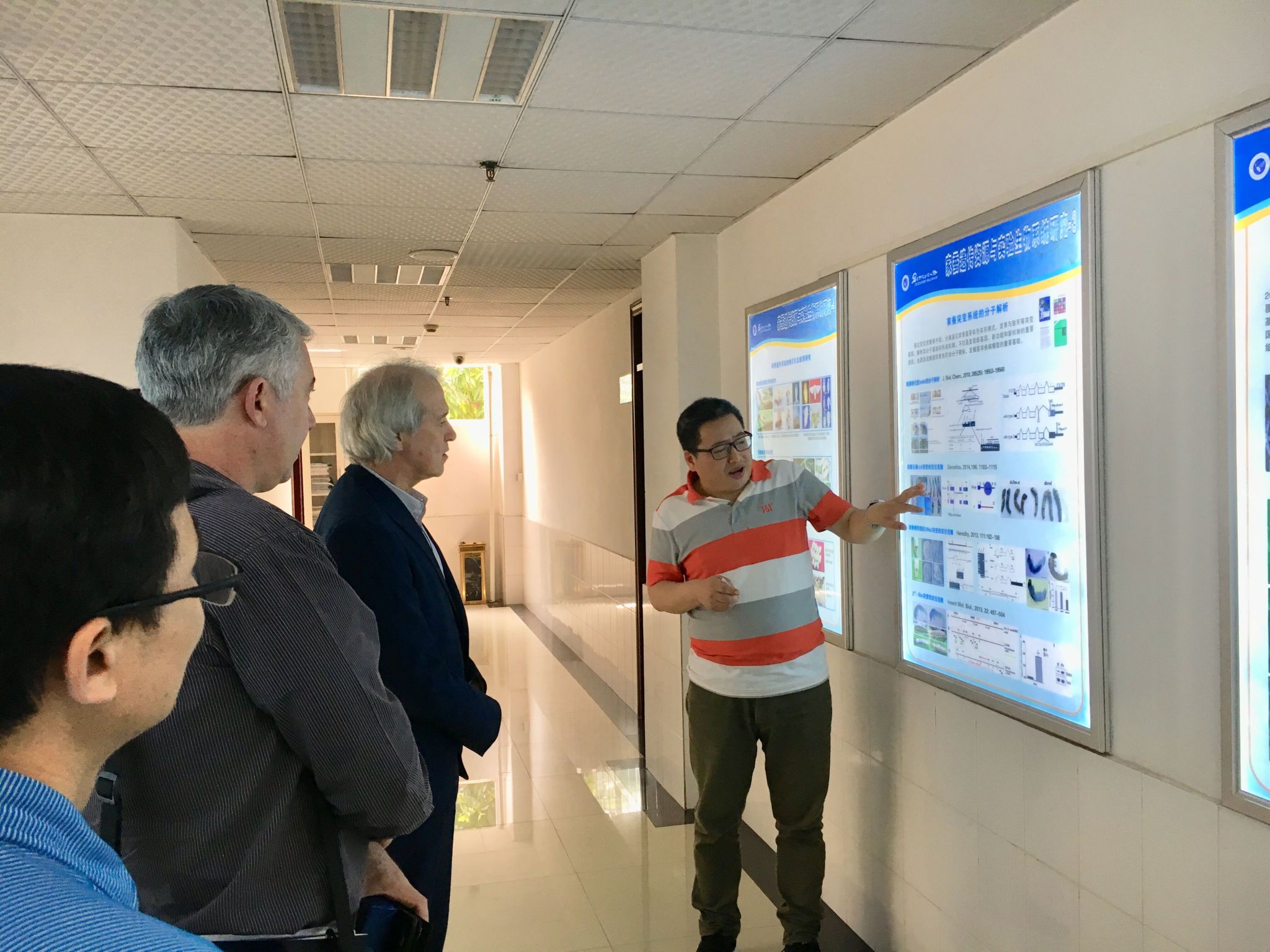 保存的蚕、桑种质资源,蚕、桑以及微粒子虫基因组及其数据库等内容表现出浓厚的兴趣,希望以后在相关领域开展合作交流。随后,曾其伟副研究员和杨利群教授分别陪同客人重点参观了家蚕国重室桑树功能基因组单元和昆虫干细胞单元。两位教授详细询问了脆弱生态环境中桑树的生态恢复功能,桑树活性物质抗氧化、抗肿瘤、消炎等功能以及桑叶、桑果的综合开发等多用途综合利用方面的科研和应用现状及开发应用前景。参观结束后,双方在蚕学宫前合影留念,双方都期待未来开展更加深入和全面的学术交流。