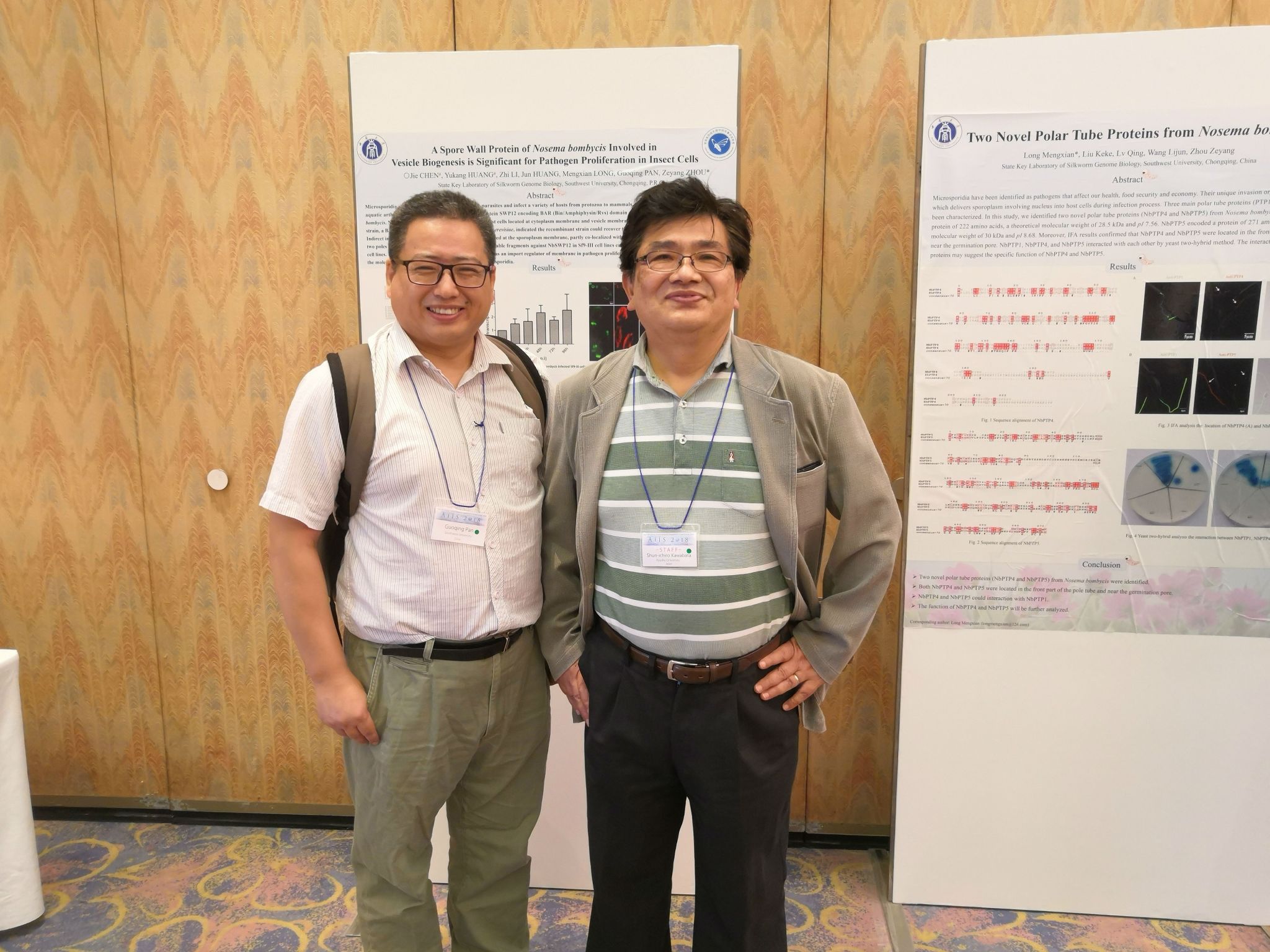 蚕桑病原微生物与微生物资源利用研究单元微孢子虫研究团队潘国庆、龙梦娴和陈洁一行3人赴日参加了本次盛会并分别做了研究报告。潘国庆研究员主持了本次会议的第四场研究报告会并作题为“Microsporidia Proliferation Characteristic in Insect Response”报告,详细介绍了微孢子虫在家蚕胚胎发育过程中的增殖特征及其对家蚕先天性免疫的影响。龙梦娴副教授作题为“Identificantion and Characterization of the Polar Tube Protein from microsporidia”的研究报告,介绍了研究团队近年来开展微孢子虫特殊侵染结构极管的研究中取得的重大突破。陈洁博士作题为“A Spore Wall Protein of Nosema bombycis Involved in Vesicle Biogenesis is Significant for pathogen Proliferation in Insect Cells”的研究报告,介绍了微孢子虫在宿主细胞中进行裂殖增殖所需的重要蛋白。