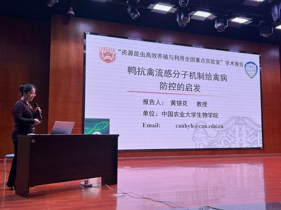 副主任李田研究员和龙定沛副教授主持。黄银花教授以“鸭抗禽流感分子机制研究给禽流感防控的启发”为题,介绍了家鸭通过MHC基因多样化扩增和NK细胞受体的调控增强免疫监视,并避免炎症风暴的机制。她还指出,MHCII伴侣分子DMB假基因降低了抗体生成效率,这解释了家鸭无症状带毒的现象,并为水禽疫苗的改进提供了新思路。