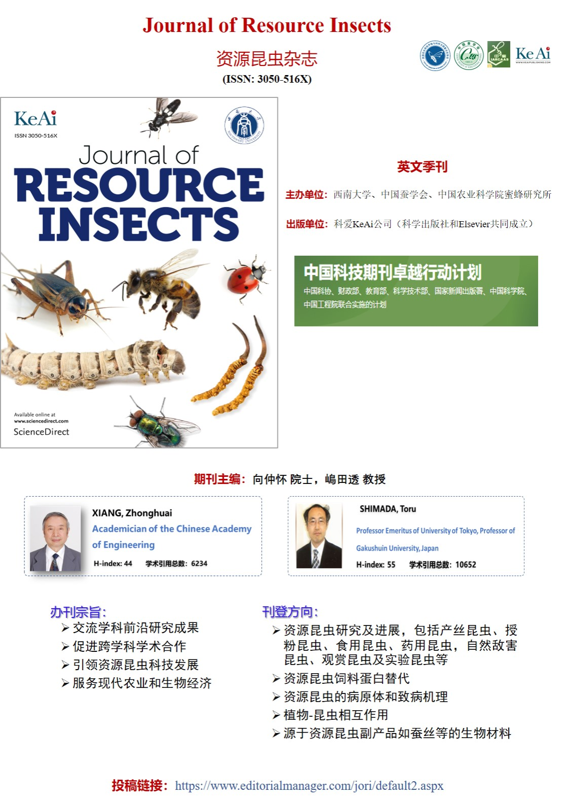 Journal of Resource Insects旨在全方位促进资源昆虫科学研究,涵盖产丝昆虫、授粉昆虫、食用昆虫、药用昆虫、自然敌害昆虫、观赏昆虫以及实验昆虫等科学研究进展。此外,JRI 还刊登有关资源昆虫饲料蛋白替代、资源昆虫的病原体和致病机理、植物-昆虫相互作用,以及源于资源昆虫副产品(如蚕丝等)的生物材料等研究进展。期刊于2024年入选“中国科技期刊卓越行动计划”英文高起点新刊项目。