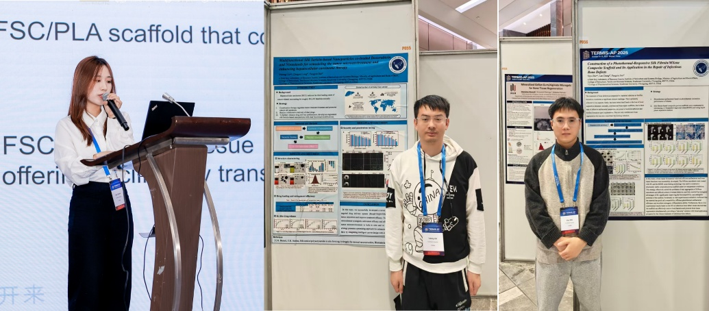 在学术交流环节,博士生张茜作题为 “Osteoimmunity-Regulating Biospun 3D Silk Scaffold for Bone Regeneration in Critical-size Defects” 的口头报告,聚焦骨免疫调控与丝素三维支架的耦合策略,凭借扎实研究与清晰表达,获分论坛“Best Oral Presentation”奖。博士生刘玉隆与朱思宇完成专题墙报展示,围绕蚕丝材料在组织工程与再生医学中的应用探索展开交流。相关工作呈现了age动漫